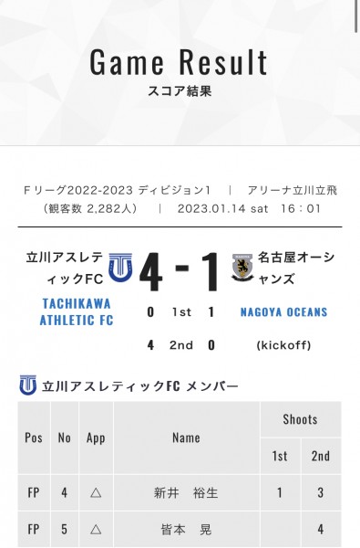 【OB情報】立川アスレティックFC 湯浅拓斗選手1月14日(土)Fリーグディビジョン1 vs名古屋オーシャンズ戦現在首位の名古屋オーシャンズに勝利。湯浅拓斗選手はスタメン出場。次節は1月22日(日)に勝ち点で並ぶペスカドーラ町田戦となります。